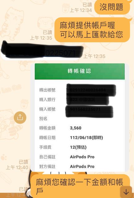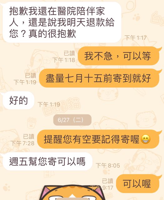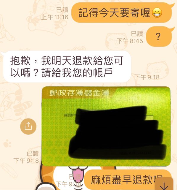 我提醒bookerrr要寄貨,他表示明日退款給我,我給予帳號。
