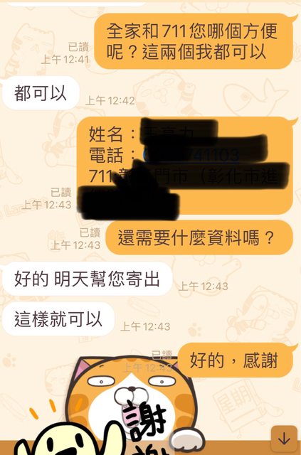 bookerrr向我要寄件資料並表示隔天(其實是當天寄出)。