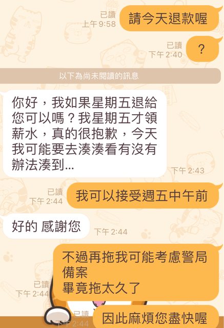 → wolfwema : 案前幾分鐘他才把錢退我,一樣的藉口跟過程,他還 07/11 16:48