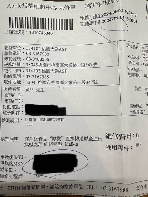 2024/9/27送修神腦,11/5領回,有保Applecare+至2025/11/5,因電池健康度低於80%送修,原廠保固規則直接換新機
