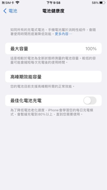 4. 電池健康度100% (因換過副廠電池,健康度不可考,但充飽待重置狀態閒置了6天還