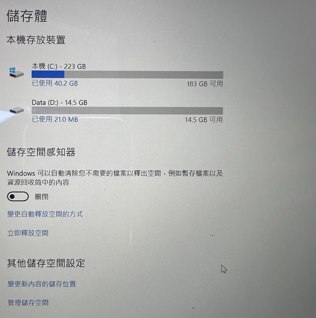 我有將256G分割成C槽223G、D槽15G