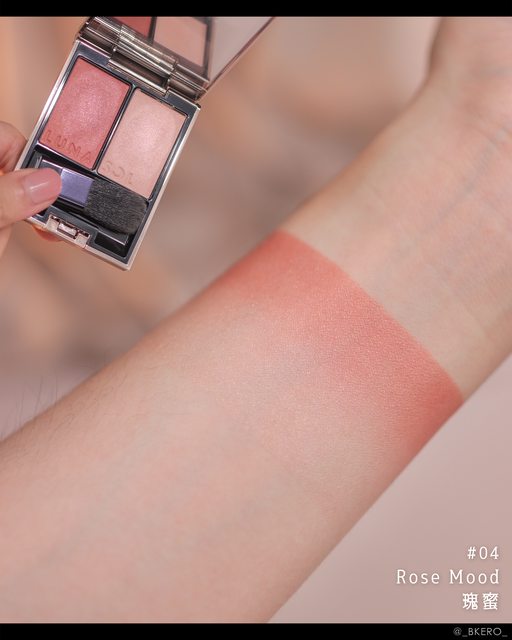 有收斂感但是轉正面不顯黑的茶玫瑰色調頰彩,裡面有粉色與紅色的珠光