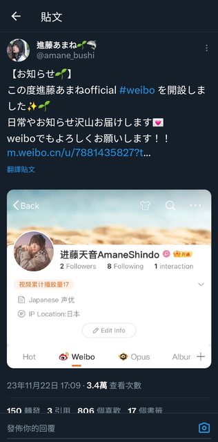 進藤天音也開設 #weibo 了
