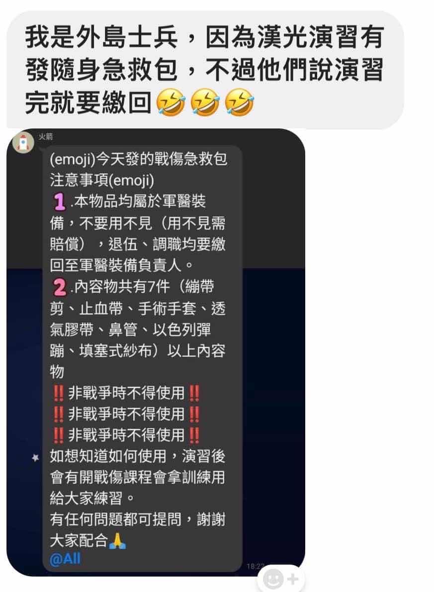推 afv : 畢竟漢光帶出來的急救包,是戰備用的,訓練用有另一 07/27 21:00