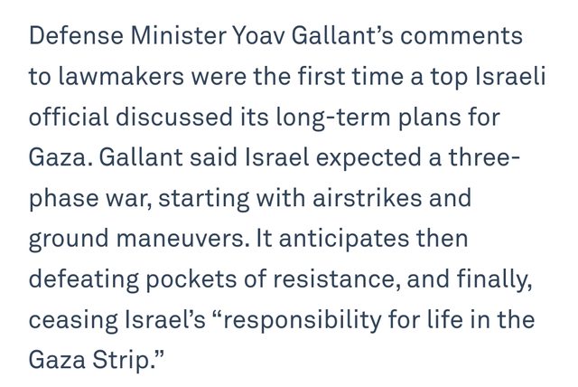 如題啦 以色列國防部長Yoav Gallant昨天表示 在解釋以色列對這片擁有超過230萬居民的巴勒斯坦飛地的意圖時 表示以色列沒有計畫要長期佔領加薩 Yoav Gallant在向立法者介紹 以色列對加薩的長期計畫時提出了一個三階段的計畫 首先,以色列的空襲和機動(Maneuvering) 推測是剷除哈馬斯的大規模地面/空中聯合行動 接下來第二階段將進行一場強度較低的戰鬥以擊敗剩餘的抵抗力量 Yoav Gallant最後表示 第三階段就是終止色列對加薩地帶生命的責任 https://i.imgur.com/QhPikMt.jpg