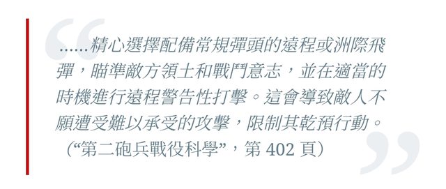 他們相信 如果不得不使用這些常規洲際彈道飛彈 美國政府或任何其他潛在的擁有核武的對手 用核武報復的可能性將大大降低 如果解放軍相信自己一定能夠逃脫美國核反擊的話 這可能會增加使用這種常規打擊的意願 但是這實際上會帶來更大的風險 因為美國政府有明確的核威懾政策 其中保留用核武應對足夠嚴重的非核打擊的權利 此外根據洲際彈道飛彈的設計 美國政府可能不知道來襲洲際彈道飛彈是否帶有核武器 因為反應的時間實際上非常有限 在解放軍彈頭到達目標之前美國可能會直接發射核彈以反擊 而不會等到確認是否是常規彈頭還是核彈頭才進行反擊 中國長期以來一直積極利用這種模糊性和不確定性 作為其威懾戰略的一部分,特別是中短程彈道飛彈 東風26 中程彈道飛彈就是一個典型的例子 那飛彈可以根據需求直接調整常規武器彈頭或核彈 這就會導致中國發射的飛彈不易被識別彈頭內容 那麼在引爆之前就無法清楚中國發射的是什麼 在這種組合中加入常規彈頭的洲際彈道飛彈 只會進一步增加雙方誤解和誤判的風險 解放軍如果透過這種額外的常規能力打擊美國的意願增強 可能會把情況升級到非常危險的程度 這就是為什麼美國後來放棄常規三叉戟彈道飛彈的原因 CTM常規三叉戟飛彈後來被取消 因為擔心對手看到CTM發射可能會認為 美國正在發射攜帶核武的三叉戟飛彈 為了避免這種混亂,美國通常保留不同類型的飛彈 來攜帶核彈頭和常規彈頭 不過這不是解放軍首次把常規彈頭裝上洲際彈道飛彈的想法 2004年出版的解放軍《二砲作戰科學》當中 廣泛討論了中國軍隊如何在戰時使用其戰略飛彈部隊 儘管該文件在這一點上已經非常過時 但仍然是少數的公開來源之一 為了解解放軍如何看待核打擊和常規飛彈打擊提供了一個管道 解放軍當時的二炮(就是現在的解放軍火箭軍) 參與聯合作戰「抵禦強敵干預」的部分中,作者指出: ……精心選擇配備常規彈頭的遠程或洲際飛彈 瞄準敵方領土和戰鬥意志 並在適當的時機進行遠程警告性打擊 這會導致敵人不願遭受難以承受的攻擊限制其干預行動 (“第二砲兵戰役科學”,第402頁) https://i.imgur.com/A20oxSU.jpg