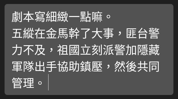 推 toulio81 : 這種劇本對台灣反而比較有利,對中國不利,基本上 11/15 13:57