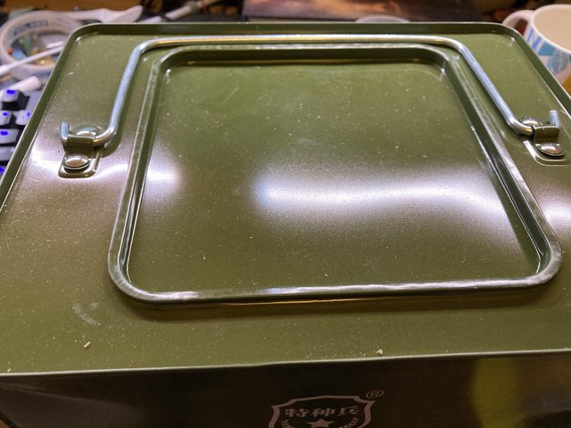 : 老實說鐵皮有點薄 (相對於彈藥箱) : 蓋上有打製造日期 (被反光擋住) : 還有把手 : 上方下凹所以多箱疊起來後不會因把手而無法疊起 : https://i.imgur.com/hHQT8YU.jpeg