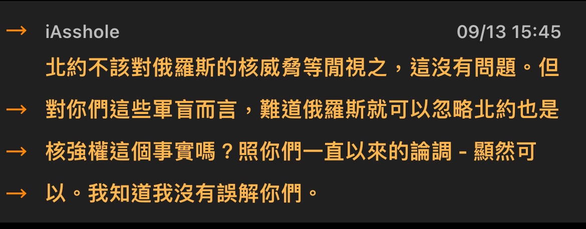 → jayppt : 就鍵盤俠不怕核彈 歐美北約不知怕什麼 收到 09/13 15:15