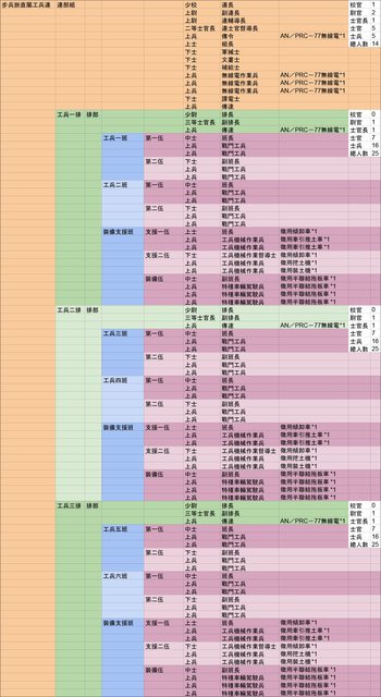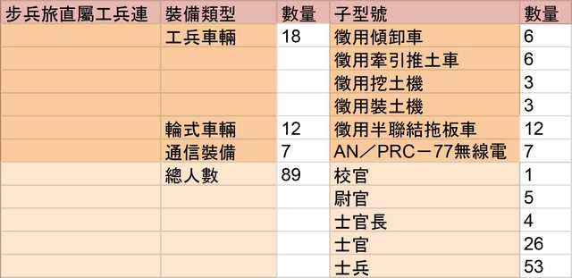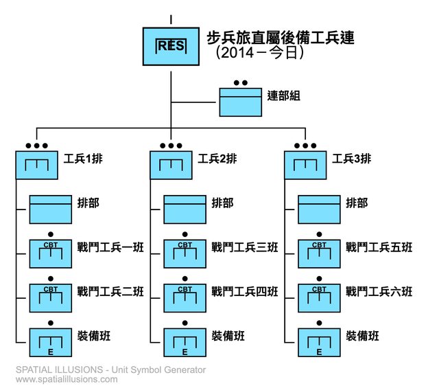 規模則較小,每個旅皆配備一個工兵連(動員符號尾數8),連編制分為連部組、工兵1-3