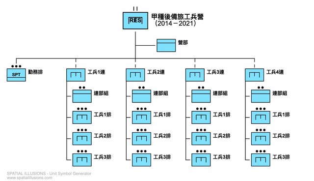 旅),每個旅皆配備一個工兵營(動員符號尾數8),營編制分為營部及勤務排、工兵1-4