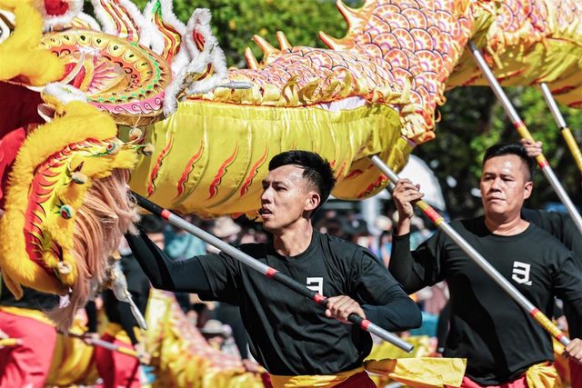 共同演出,結合了舞龍、戰鼓和雜技,充分展示中華文化的恢宏氣勢。表演中,隊員們靈