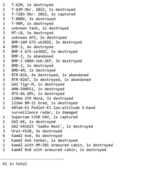 目視確認損失軍事裝備統計 2024.11.01 ~ 11.04
