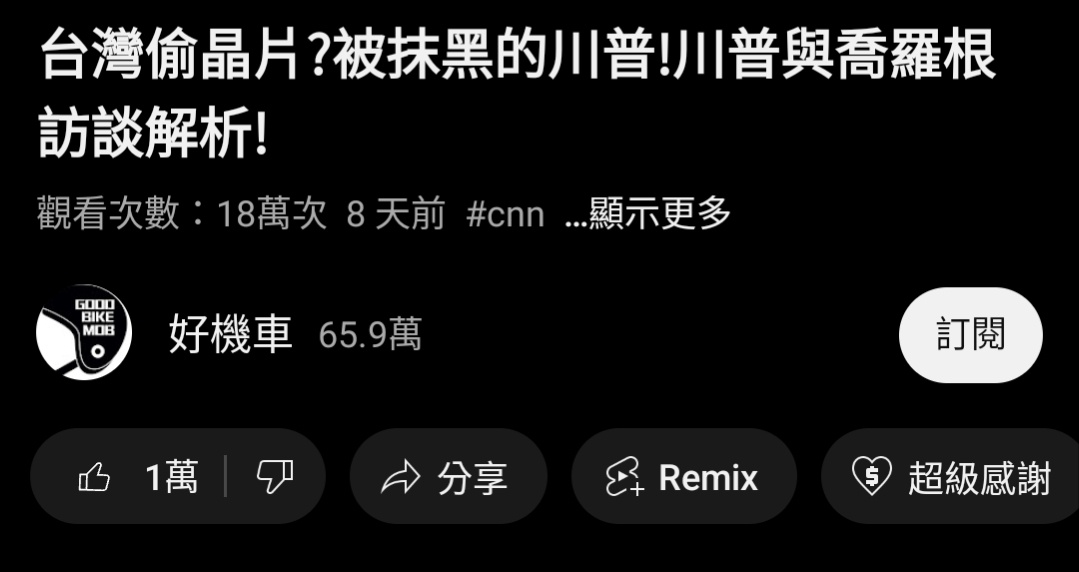 → PTTHappy : 斷章取義 上述影片至少比較完整的解析川普對台想法~ 11/07 12:26