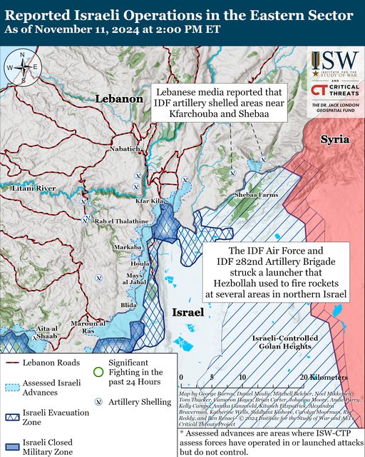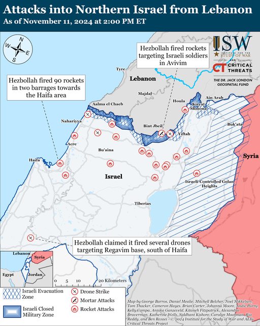 自 11 月 10 日 CTP-ISW 報告以來,真主黨已對以色列發動了至少 23 次無人機、迫擊砲和