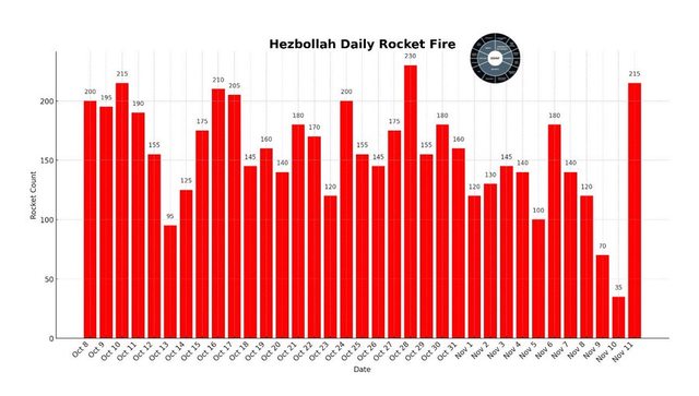 6.今天11月11日,真主黨向以色列平民城鎮發射了215枚火箭
