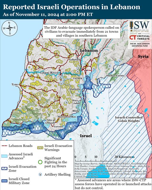 黎巴嫩消息稱,自 11 月 11 日 CTP-ISW 上次報告以來,以色列國防軍對黎巴嫩境內至少