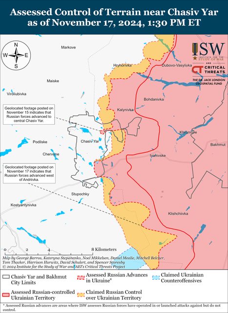 11 月 17 日,俄羅斯軍隊在 Chasiv Yar 東南
