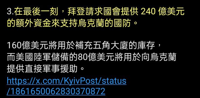 要求美國國會批准向烏克蘭追加 240 億美元的援助,並在他離任前補充所提供的武器。
