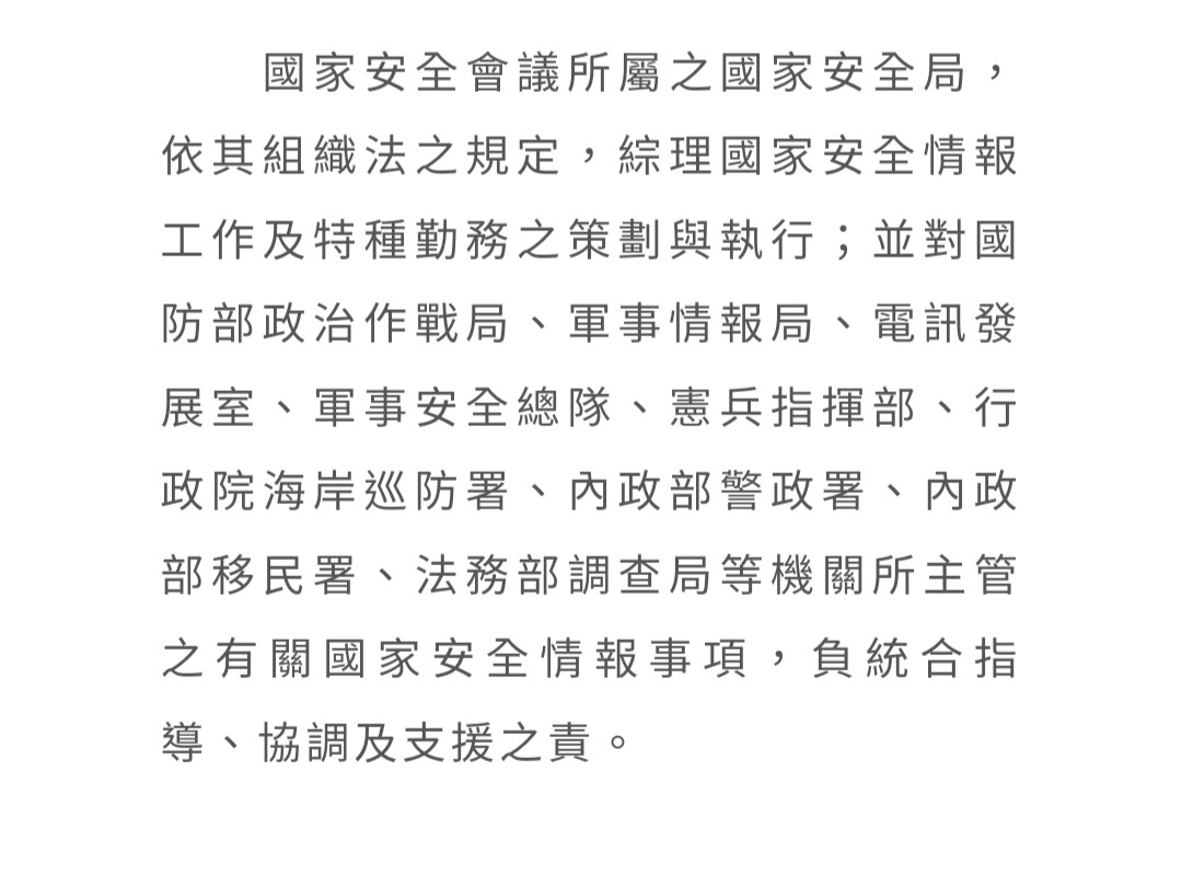 → ja23072008 : 如果認為被歸類為情治機關,受國安會指揮(?)就叫 12/03 21:46