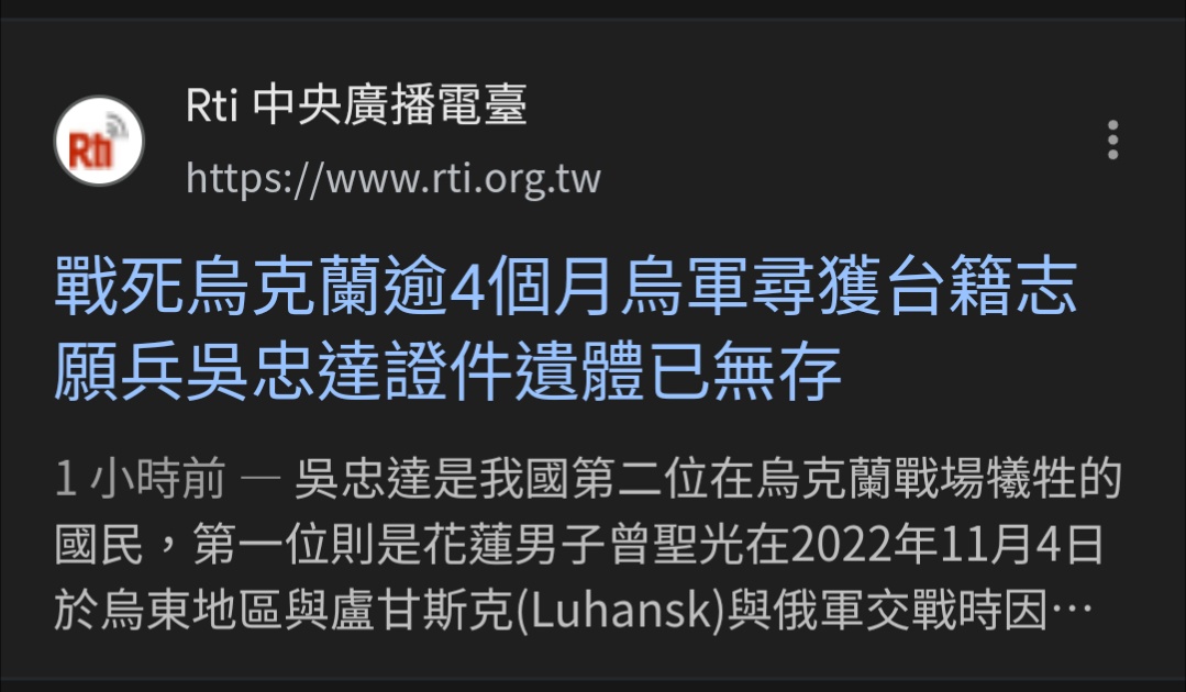 → AntiqueTea : 灣人為烏克蘭戰死,遺體餵狗」,為了錢去殺人殺的 04/02 20:20