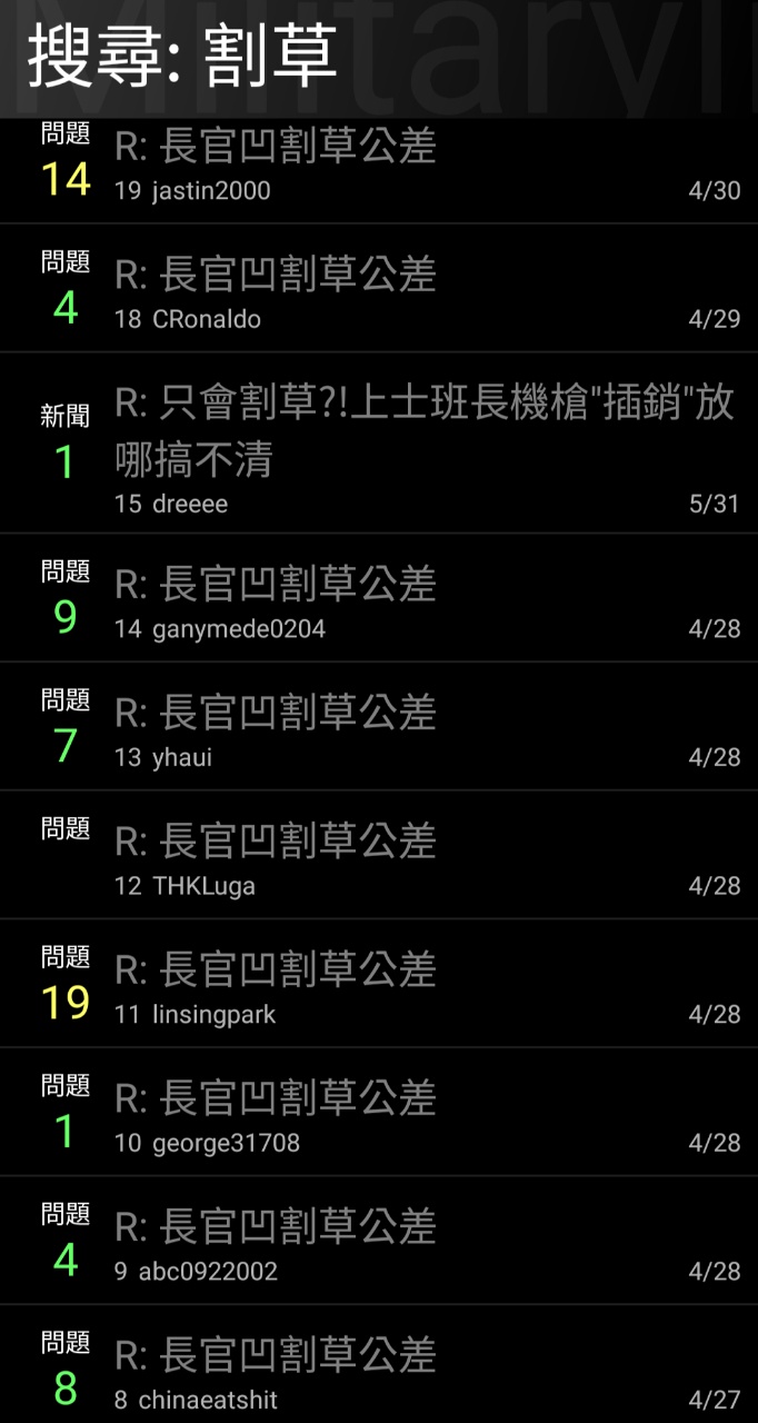 → sisik : 國軍凹人很兇狠,割草算福利,基地操練標準高, 06/26 19:15