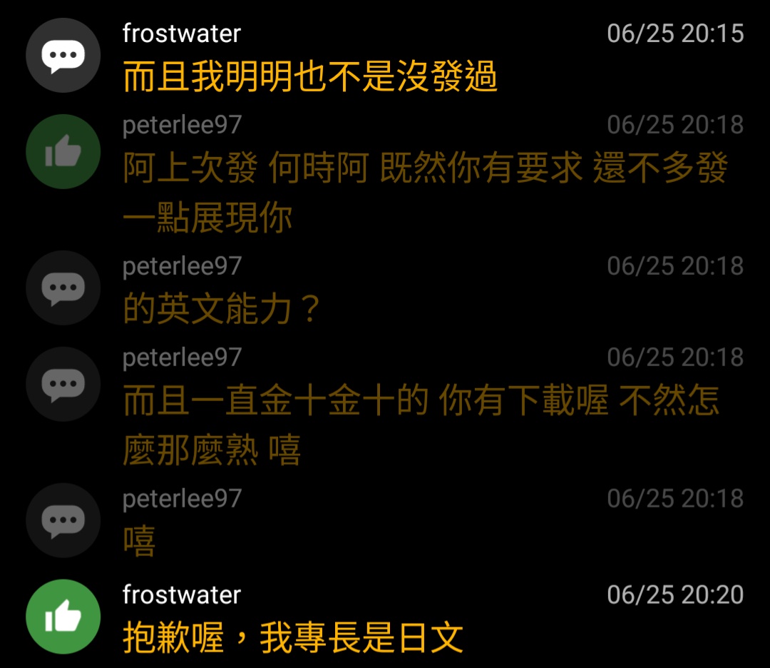 → frostwater : 不是說叫我發英文那我也不是發了 到底哪裡有問題 06/25 20:35