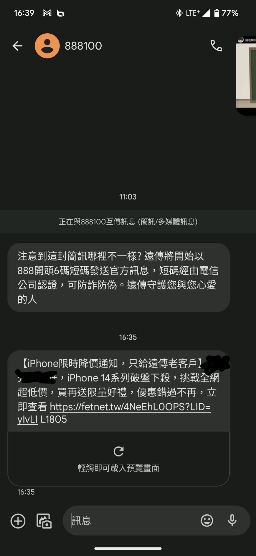→ pda2001 : 簡訊驗證這關 之後才能更改 登入的該門號密碼 詐騙08/27 10:37