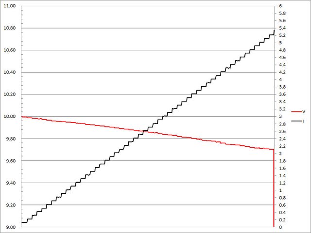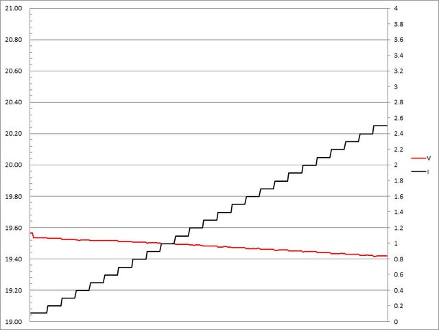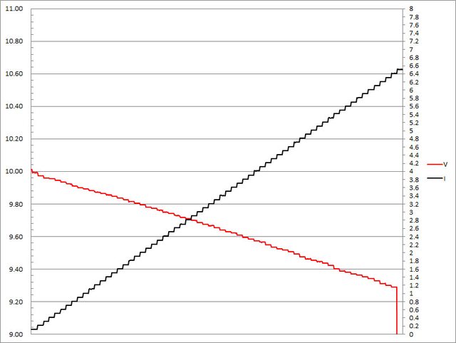 輸出電壓下降,輸出電流超過6.4A壓降,超過6.5A截止