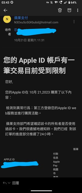 → kelon : 蘋果支付+hotmail 會被騙也太緊張了吧 10/26 10:36