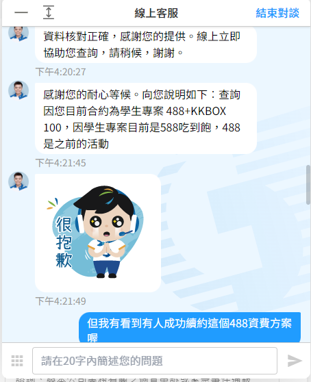 → SapiensChang: 使用中華電信文字客服說我要續約488 客服說沒有488 11/01 17:33