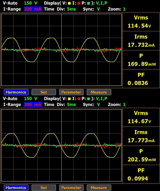 ▼單埠輸出100W的交流輸入電壓/電流/功率波形如下圖所示,此時功率因數0.9799