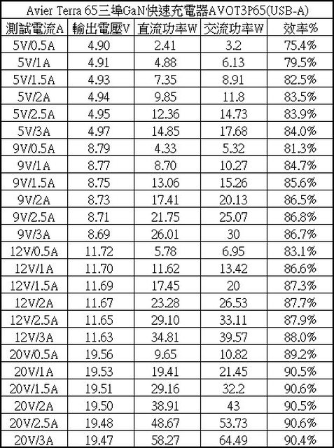 ▼A單獨使用下各組輸出轉換效率表,整體輸出轉換效率在75.4%至90.6%之間