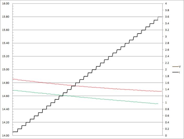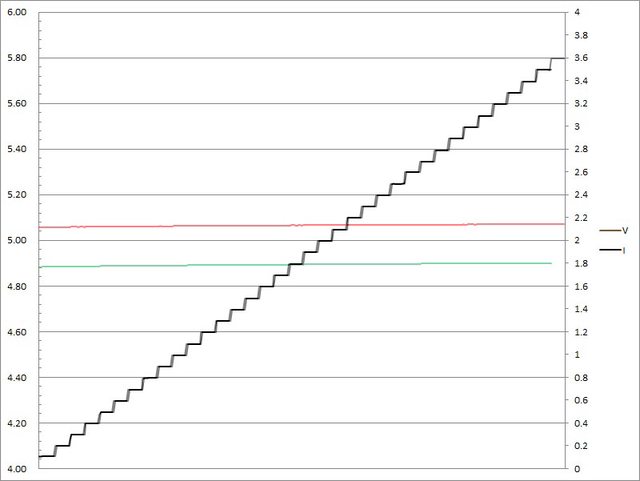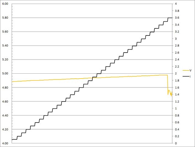 ▼A的5V輸出負載測試,電流增加時輸出電壓上升,輸出電流超過3.5A壓降,超過3.6A截
