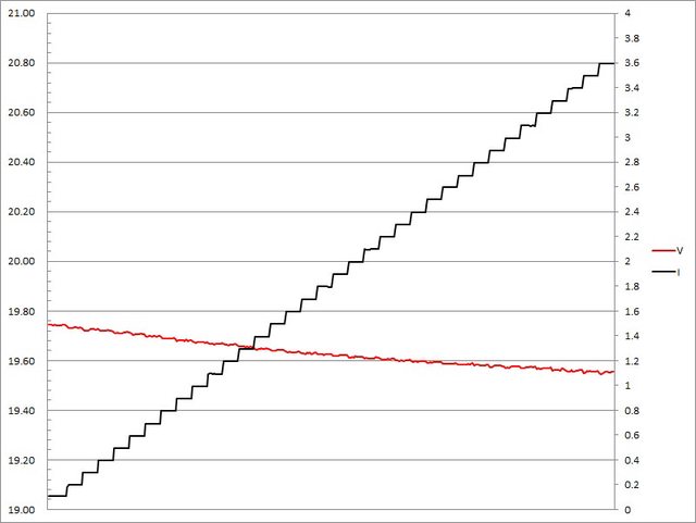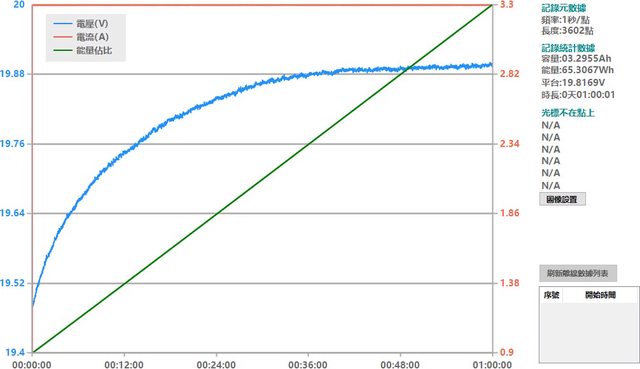 ▼A的20V輸出負載測試,電流增加時輸出電壓下降,輸出電流超過3.3A大幅壓降,超過