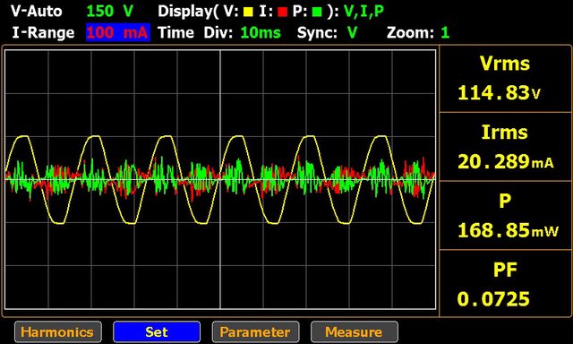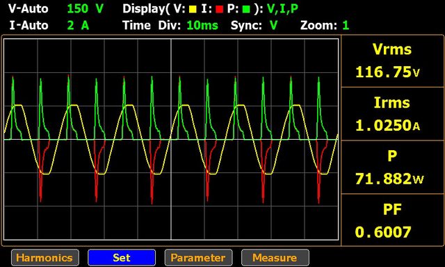 ▼C1輸出65W的交流輸入電壓/電流/功率波形如下圖所示