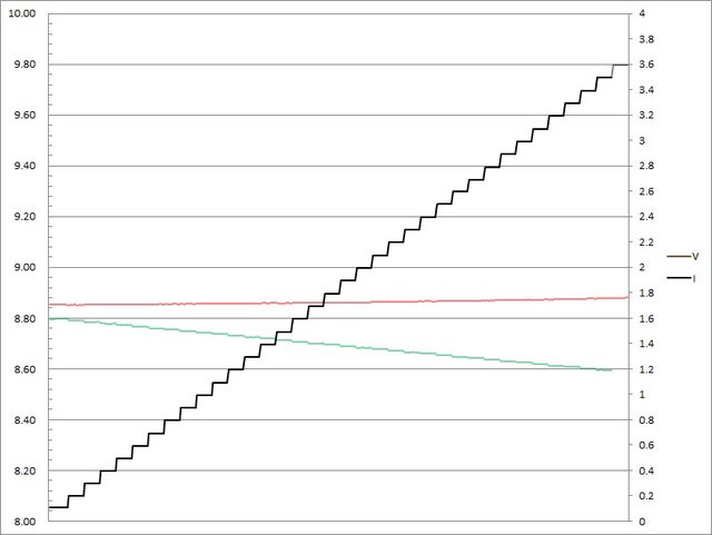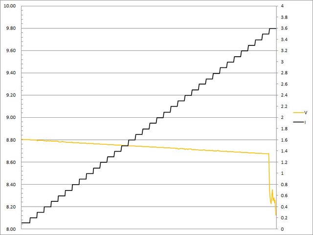 ▼A的9V輸出負載測試,電流增加時輸出電壓下降,輸出電流超過3.5A壓降,超過3.6A截