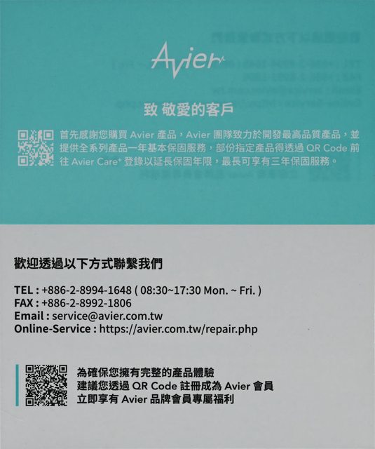 ▼Avier One Step Terra65雲霧白包裝內容有感謝選購卡、充電器、使用手冊