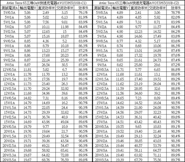 ▼C1/C2單獨使用下各組輸出轉換效率表,整體輸出轉換效率在78.7%至90.7%之間