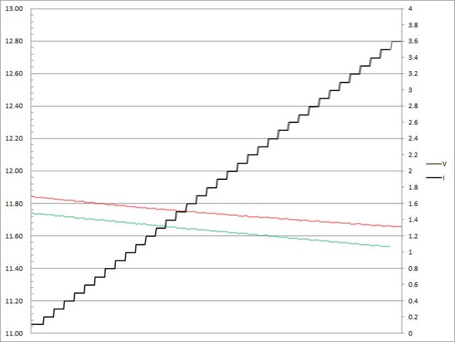 ▼A的12V輸出負載測試,電流增加時輸出電壓下降,輸出電流超過3.5A大幅壓降,超過
