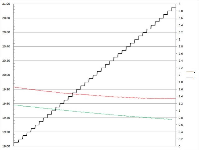 ▼C1搭配3A線材的固定檔20V輸出負載測試,電流增加時輸出電壓下降,電流超過3.6A截