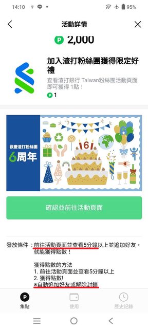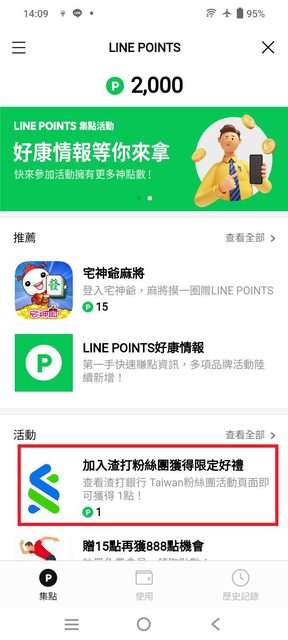 有個「渣打銀行的粉絲團限定好禮」活動=1 LINE POINT,