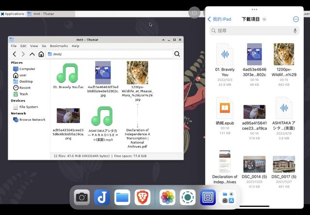 左邊是虛擬機內部的檔案管理員,右邊為iPad的檔案APP,共享資料夾的檔案會同步。