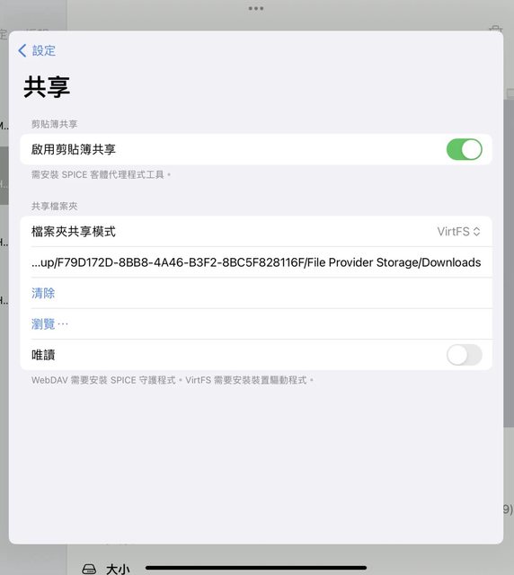 編輯UTM虛擬機,到共享資料夾啟用VirtFS (9Pfs),掛載iOS的「下載」資料夾給虛擬機