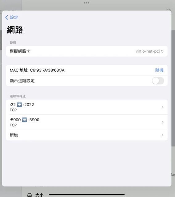UTM虛擬機預設網路無法從外部存取。編輯Alpine Linux虛擬機網路設定,新增通訊埠轉