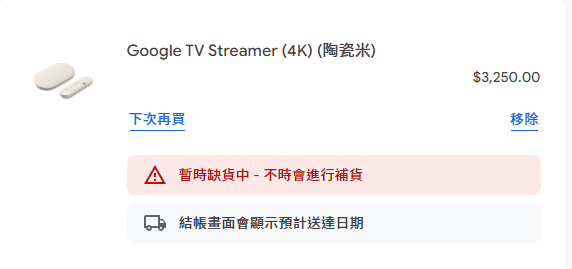 推 birdy590 : Chromecast 4K/HD 台灣在活動前就斷貨了, 我從美亞 09/27 16:48