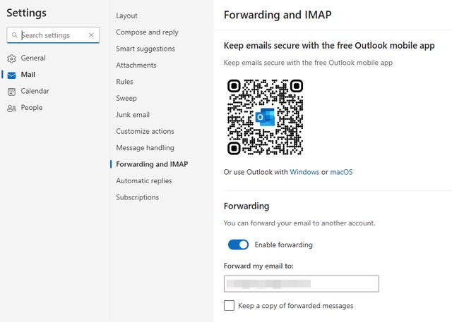 缺點是「設定轉寄前」的信仍會留在outlook