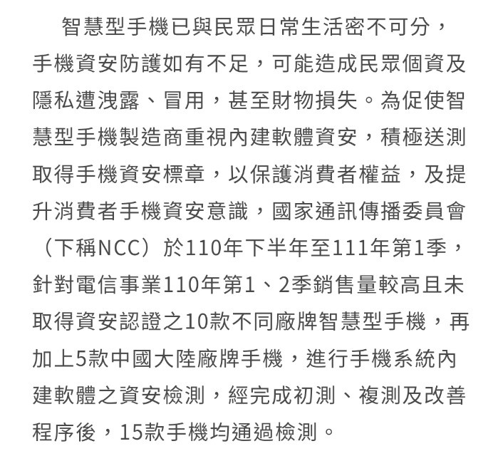 → ralpoph : 實際上NCC會定期對手機進行資安抽測 11/07 05:30