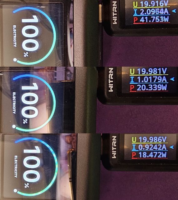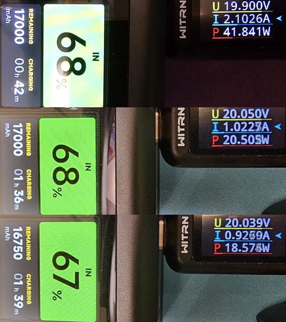 ◆雖然標示最大100W充電輸入,但從0%開始充電的充電功率僅在41W至18W間變動,導致充
